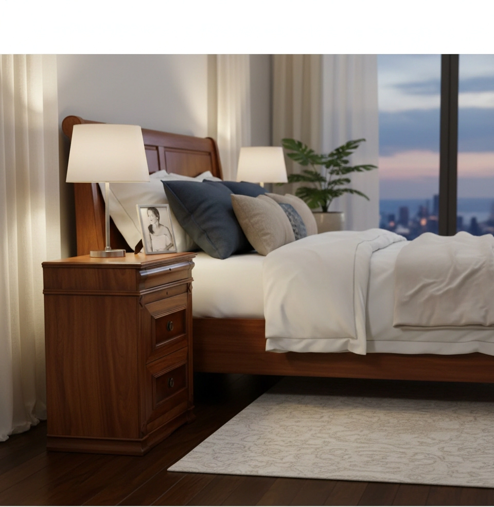 Añada un toque de distinción y calidez a su dormitorio con esta imponente mesa de noche. Fabricada con madera de veta vista y un acabado barnizado satinado, esta pieza destaca por su arquitectura robusta y detalles ornamentales que evocan el mobiliario tradicional de alta gama.