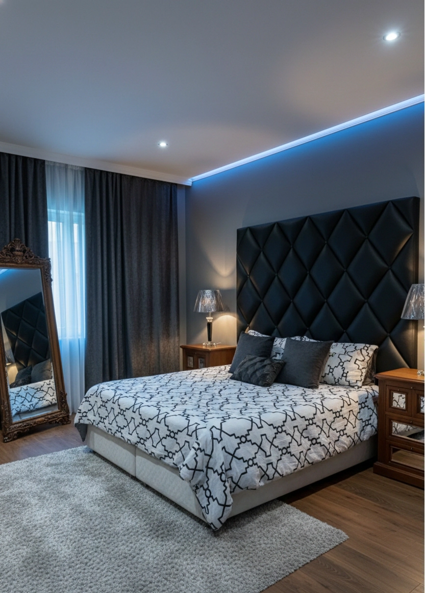 Estilo audaz con el Cabecero Vanguardia. Su acolchado con patrón de diamantes en relieve crea un juego de sombras y texturas que se convierte en el centro de atención de cualquier dormitorio moderno. Tapizado en material de alta calidad con acabado mate, ofrece una superficie cómoda y fácil de limpiar.