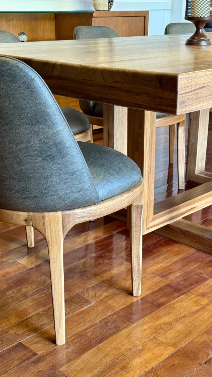 Mesa maciza en petiribi, lustrada con laca poliuretana en tono natural, con una medida de 2.20 x 1.20m